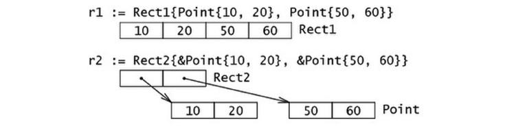 Go 语言中,结构体和它所包含的数据在内存中是以连续块的形式存在的,即使结构体中嵌套有其他的结构体,这在性能上带来了很大的优势。不像 Java 中的引用类型,一个对象和它里面包含的对象可能会在不同的内存空间中,这点和 Go 语言中的指针很像。下面的例子清晰地说明了这些情况:
